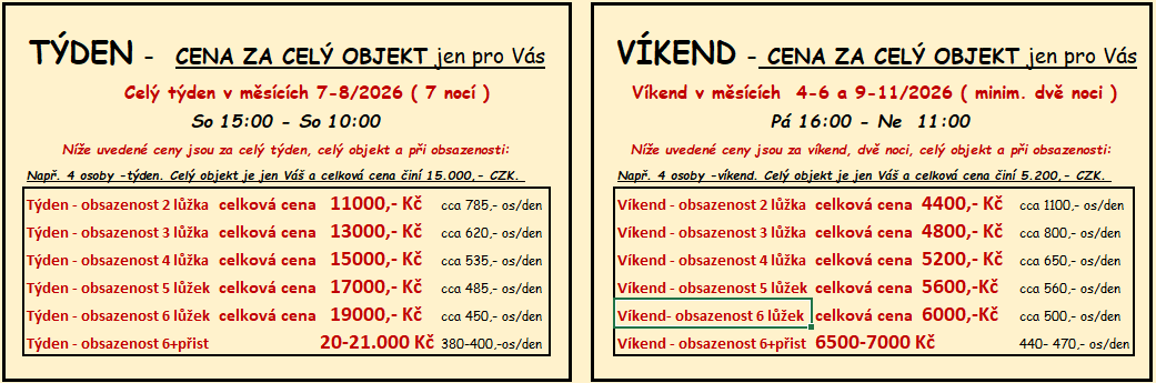 V červenci a srpnu pronajímáme převážně na celý týden a to od soboty 15:00 do soboty 10:00