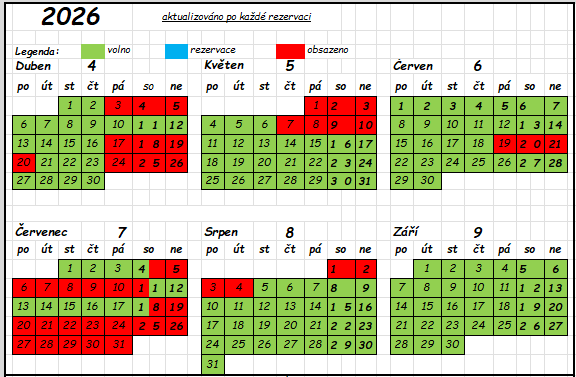 Rezervační systém není interaktivní a Vaši rezervaci do kalendáře vkládáme my, po mailové nebo telefonické domluvě. Po rezervaci prosíme o úhradu zálohy do 4 dnů , čímž je tato oboustranně závazná.